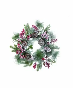 Amplify the joyful flair of your décor by hanging this evergreen wreath on your window, wall or door. Berries and pine cones maximize its festive factor.