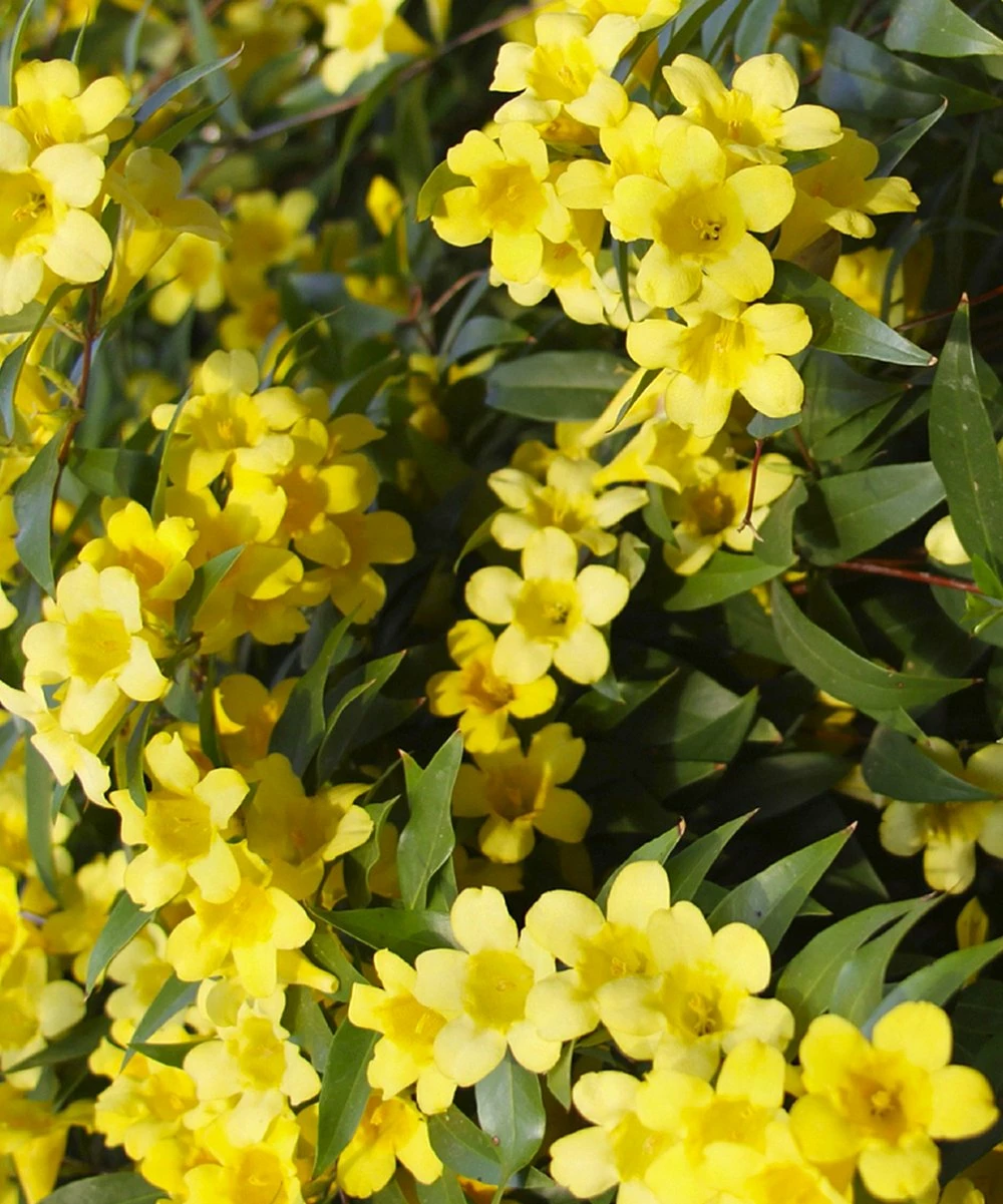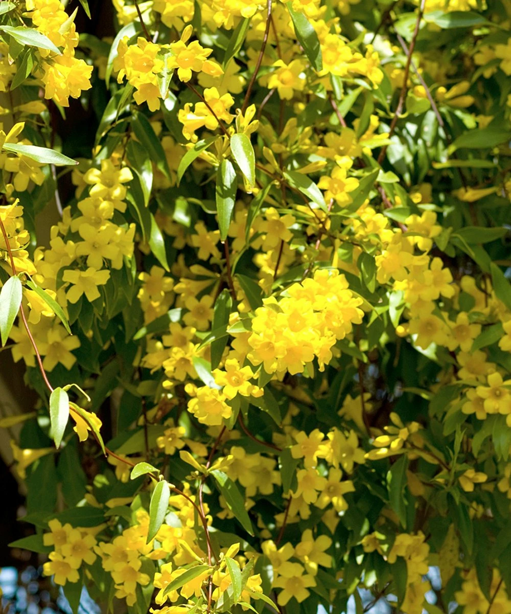 Carolina Jasmine features glossy, evergreen leaves and waxy, trumpet-shaped flowers that fill the garden with an intoxicating floral fragrance. This perpetually blooming vine produces an abundance of sunshine yellow, star-shaped blossoms in late spring with an encore performance in fall. An excellent choice for masking unsightly areas, Carolina Jasmine climbs trellises, arbors, and fences to create a flowing pop of color.