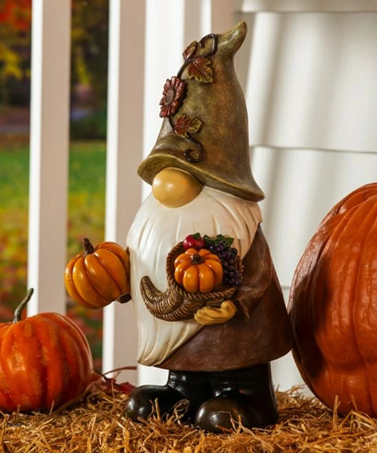 Add a welcoming touch to your festive scenery with this whimsical garden gnome holding a cornucopia and pumpkin for added seasonal cheer.