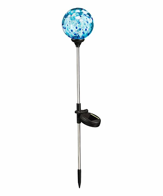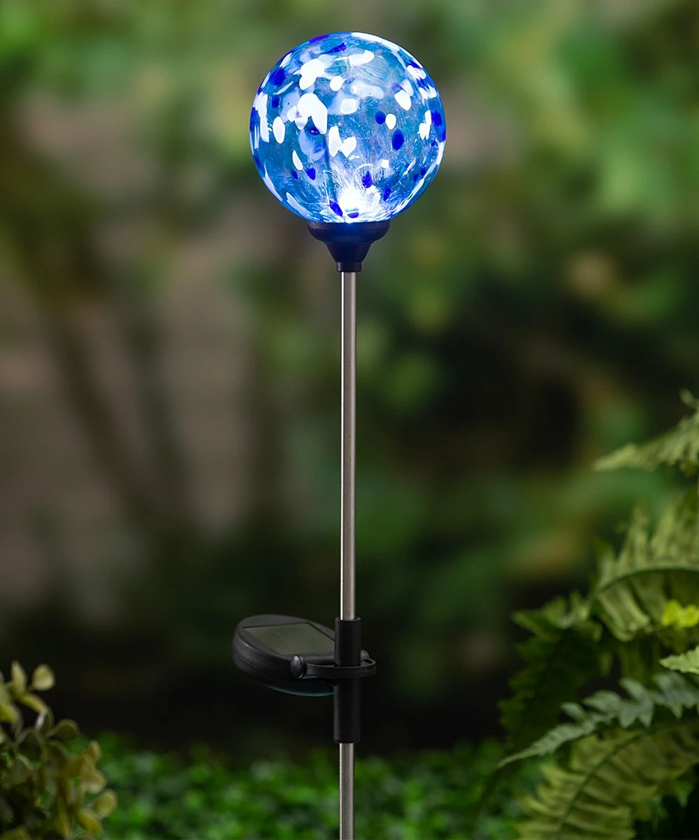 Accent your outdoor space with this garden stake featuring a colorful glass orb. Solar-charged design lights up at night.