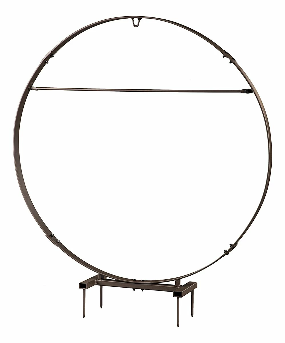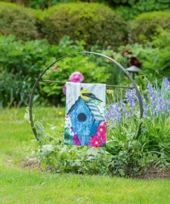 This circular outdoor decoration in durable iron gives you a place to hang a welcoming flag or basket of blooms.