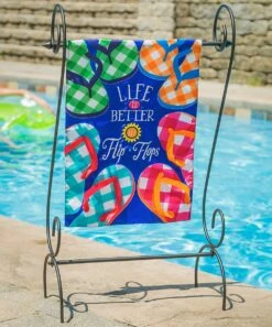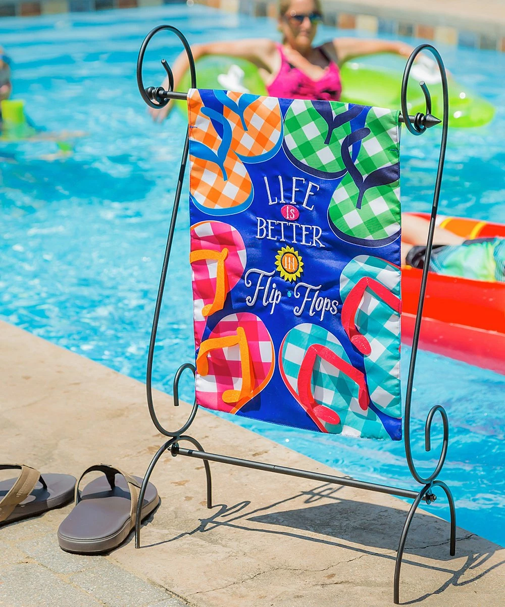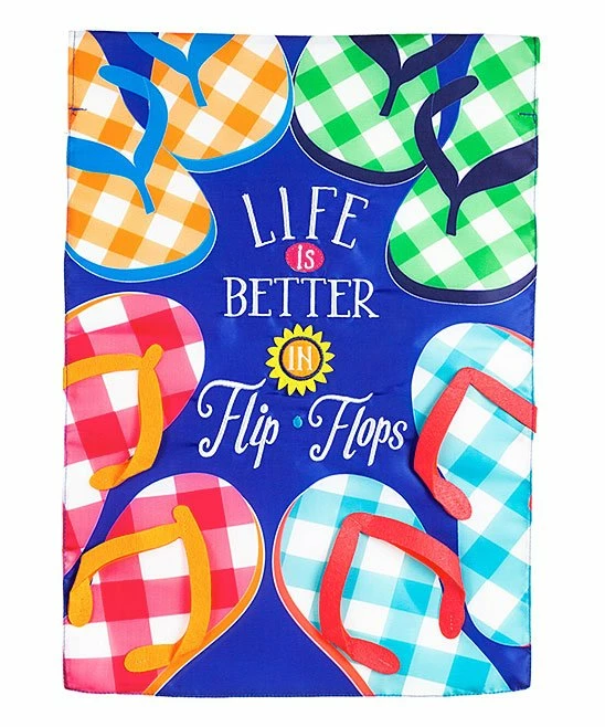 Deliver a pop of color to your backyard entrance or poolside area using this outdoor flag featuring a flip-flop design and playful message.