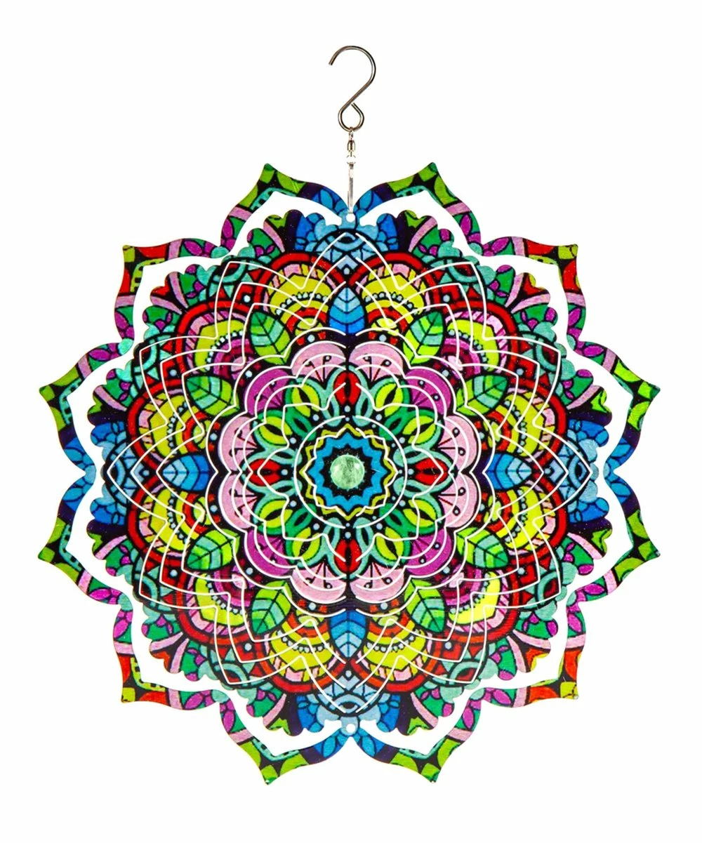 Bring new life to your garden with this 3D optical illusion spinner featuring a mandala flower design and a hook for hanging.