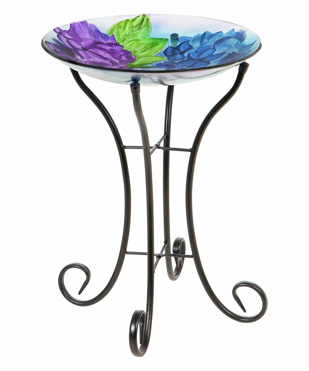 Offer your feathered friends a great hangout with this bird bath that features a colorful plate and scrolling stand to elegantly complement your outside aesthetic.
