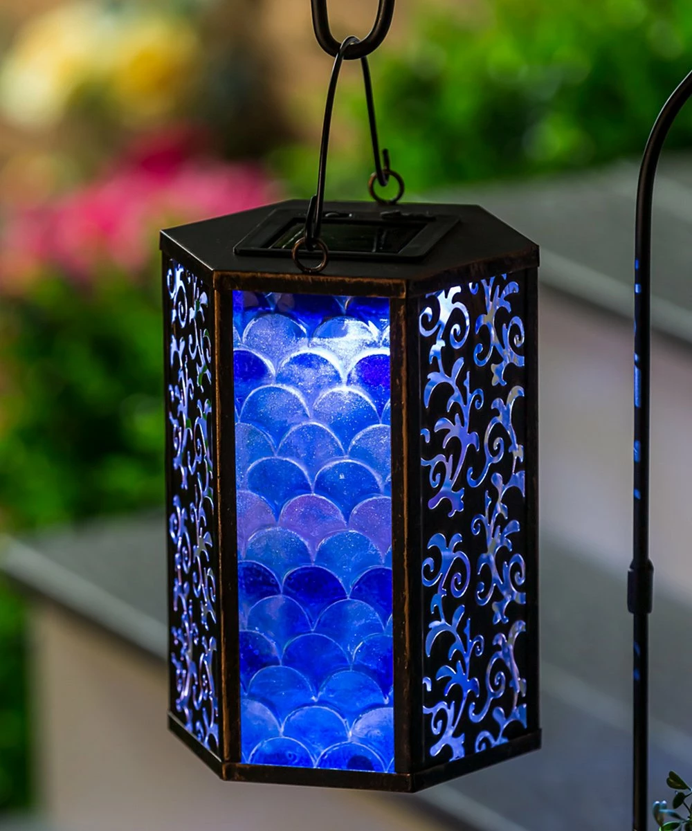 Add a gorgeous accent to your lawn or outdoor space with this gorgeous hand-painted solar lantern.