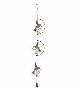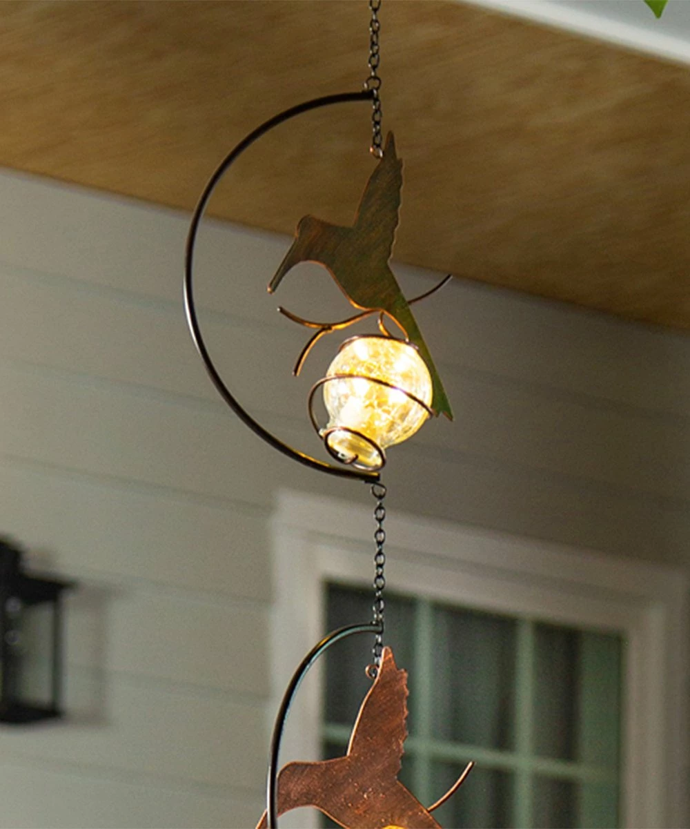 Hanging décor featuring a trio of orbs and artful hummingbird accents. Features a lighted design charged by the sun.