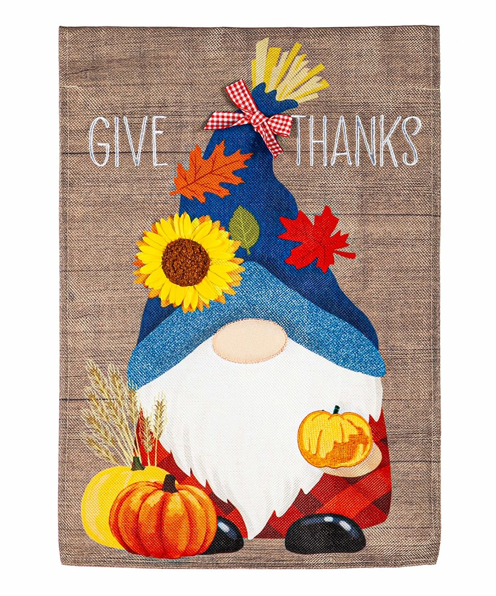 Display this outdoor flag for autumn appeal with its gnome design covered in leaves and pumpkin.