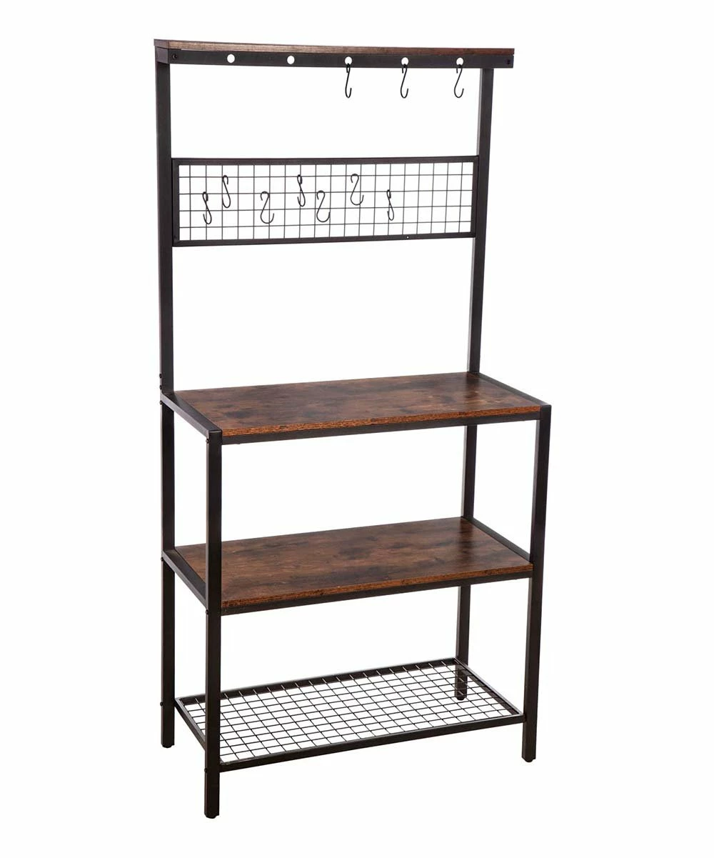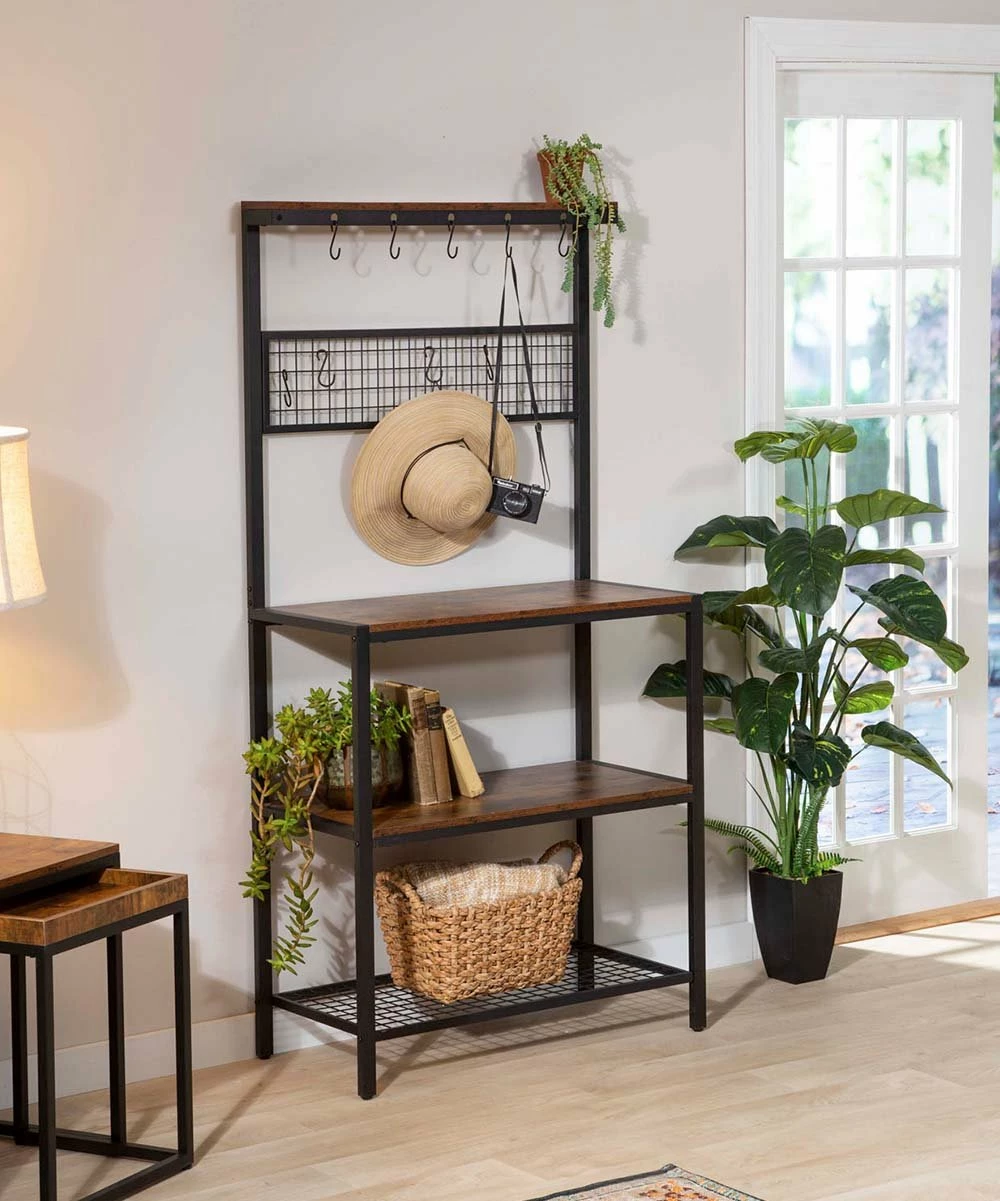 Create an organized space with this shelving display featuring several hooks and shelves to store your essentials and add a contemporary vibe to your space.