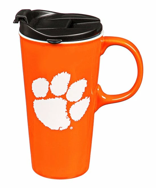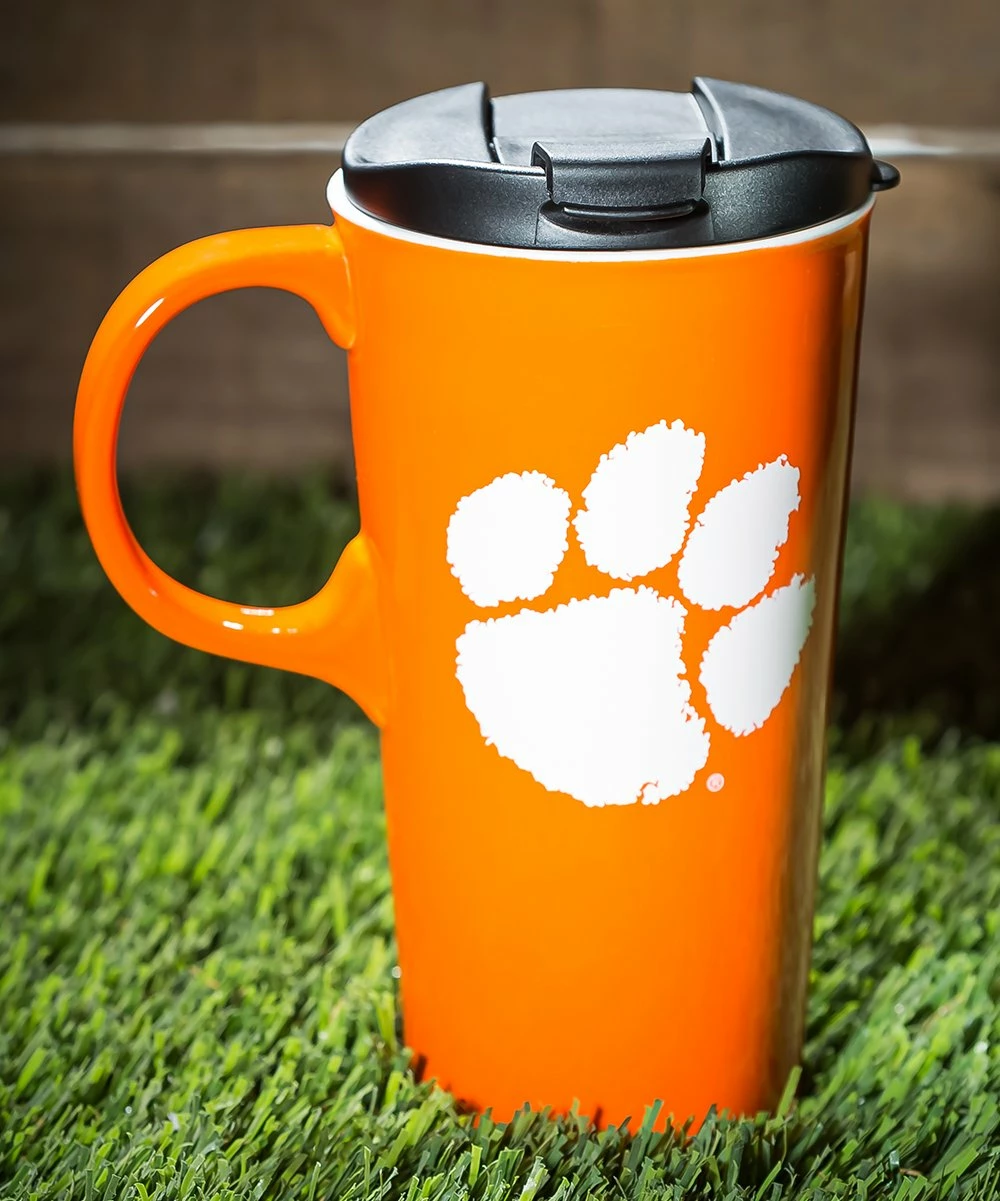 Take your latte to go with this attractive travel mug featuring a durable lid, a decorative box and a bold way to show off your team spirit.