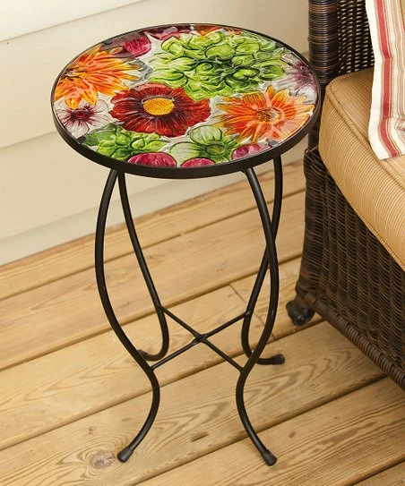 This gorgeous glass side table boasts a whimsical floral design and durable construction to add a touch of long-lasting, classic charm to the porch or patio.