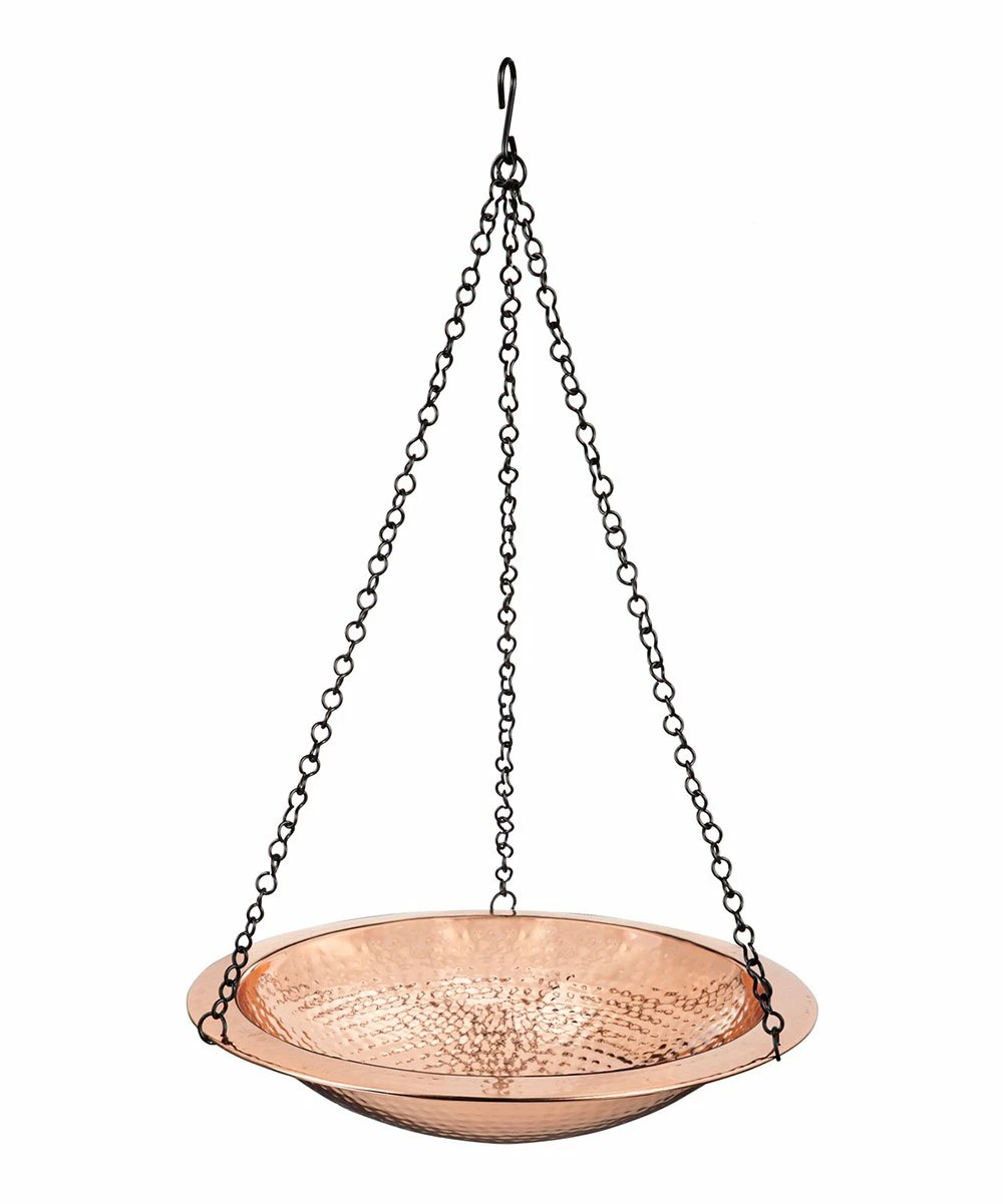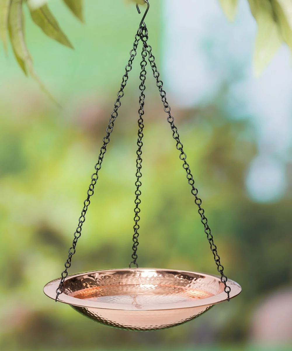 Accent your garden with the modern design of this hanging birdbath featuring sleek hammered metal.