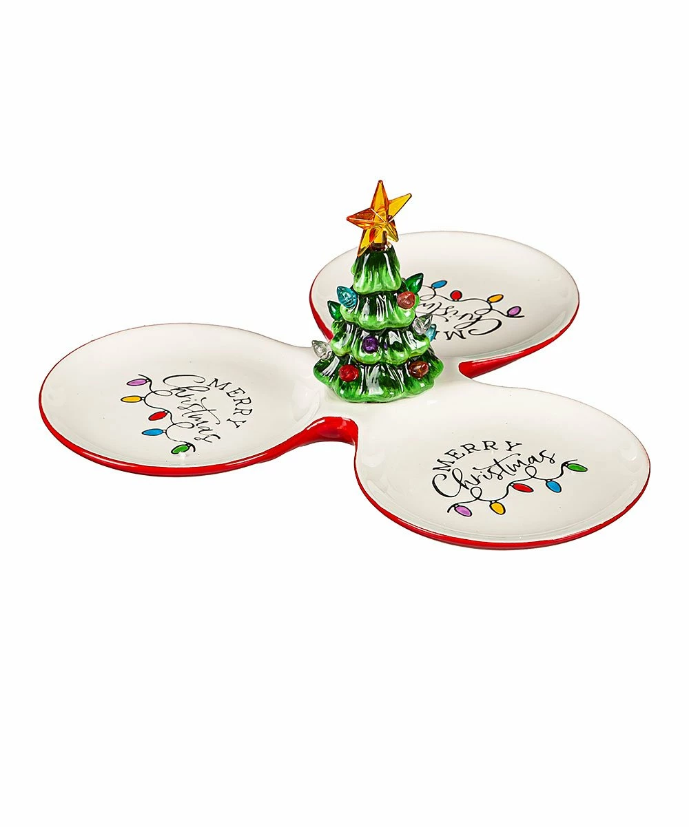 Festive three-dish serving tray featuring a central LED Christmas tree ornament.