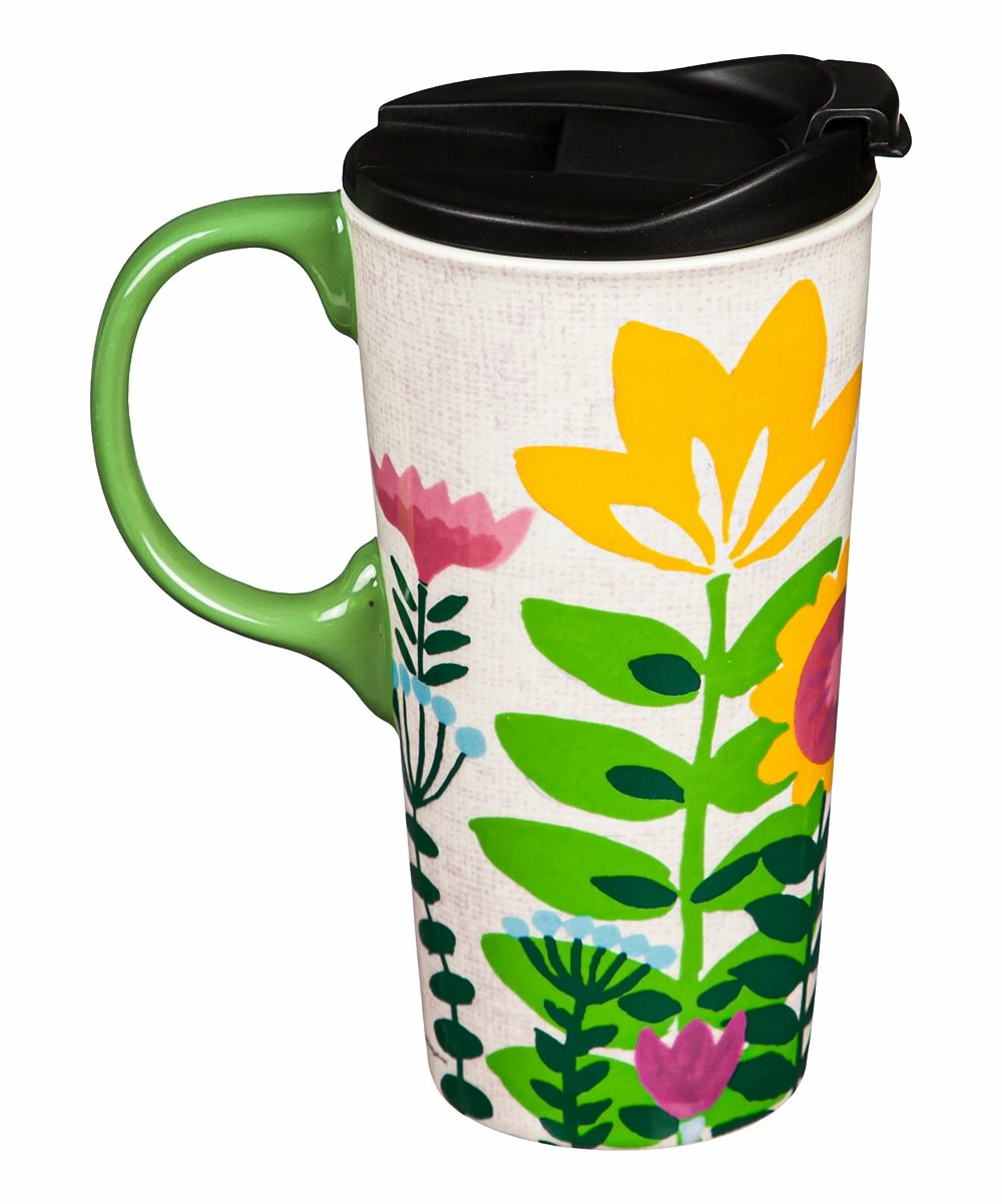 - Includes green and yellow primitive floral travel mug and green and yellow primitive floral box (two pieces total)