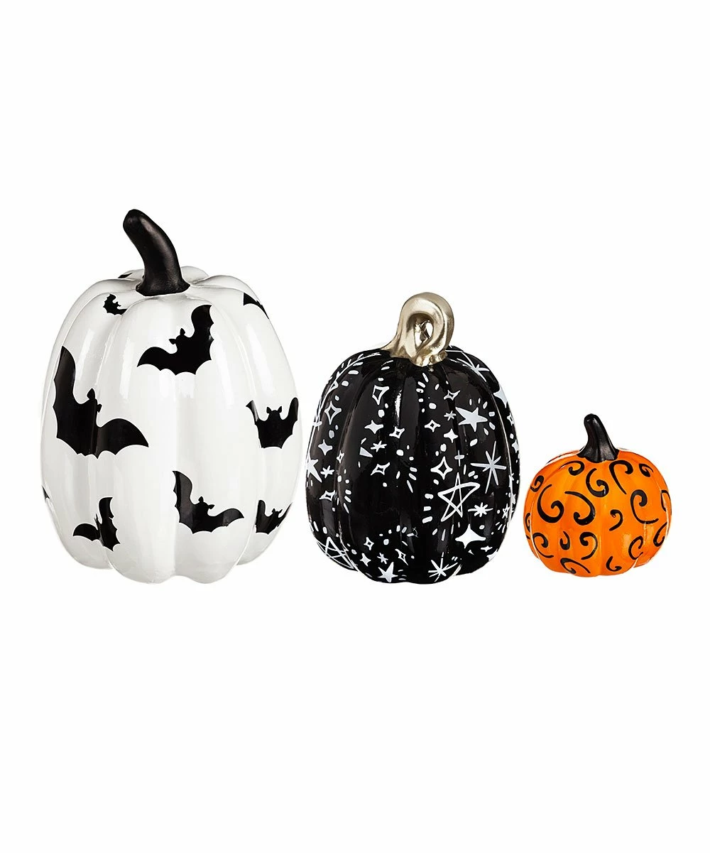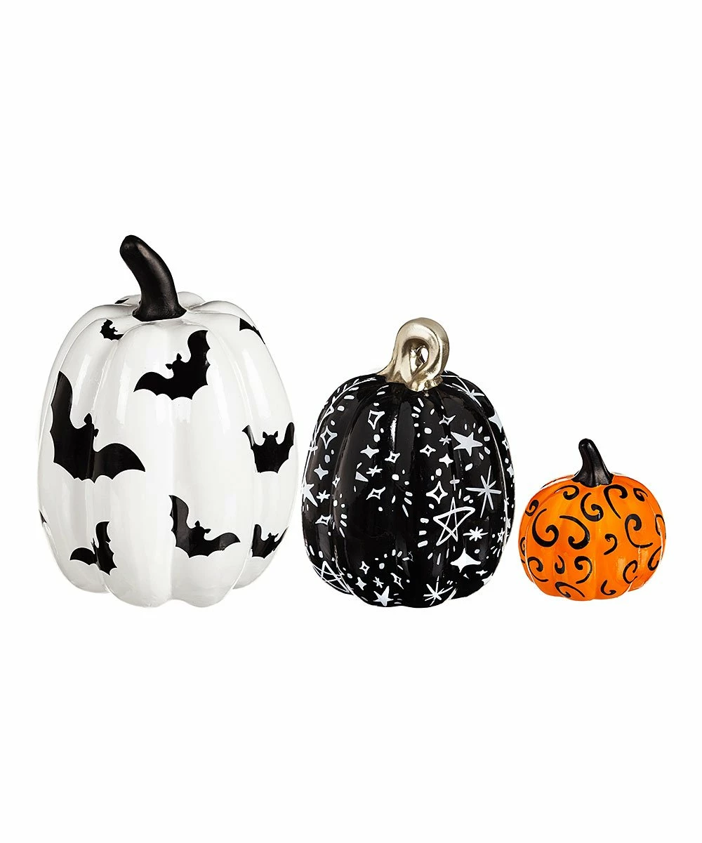 Lend a dose of seasonal splendor to your home with this matching set of pumpkin figurines in three festive Halloween designs.