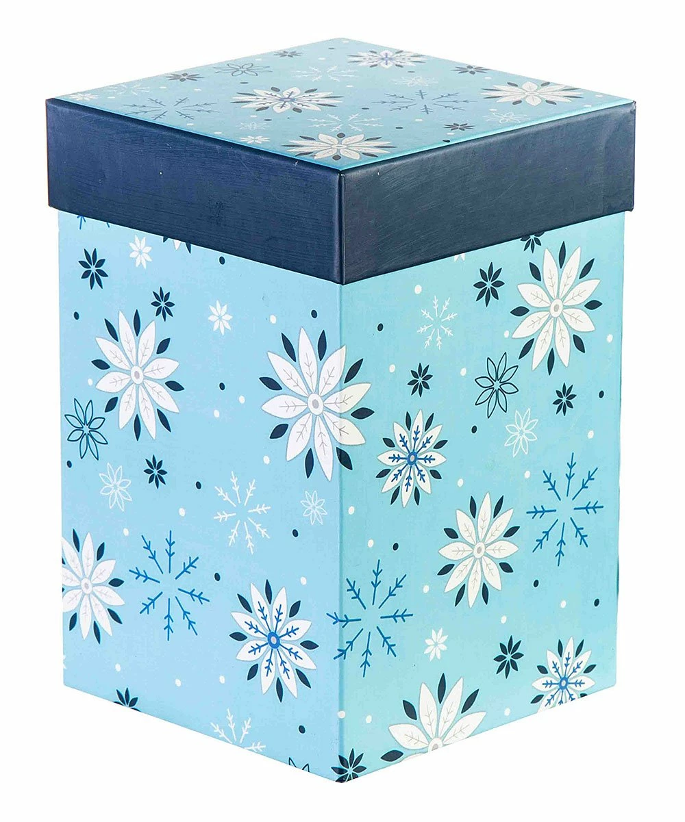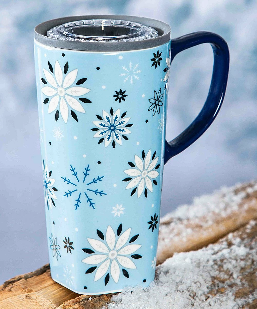 - Includes one light blue snowflake travel mug and one light blue box (two pieces total)
