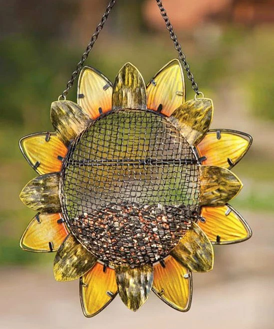 Little feathered aeronauts can cool their jets for a tank refill on this hanging, perched bird feeder that sports a summery, sunflower design.