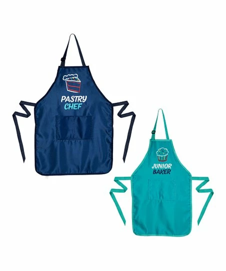 - Includes navy cake slice adult and teal cupcake kids apron (two pieces total)