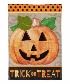 This garden flag features a spooky jack-o’-lantern motif and a colorful design.