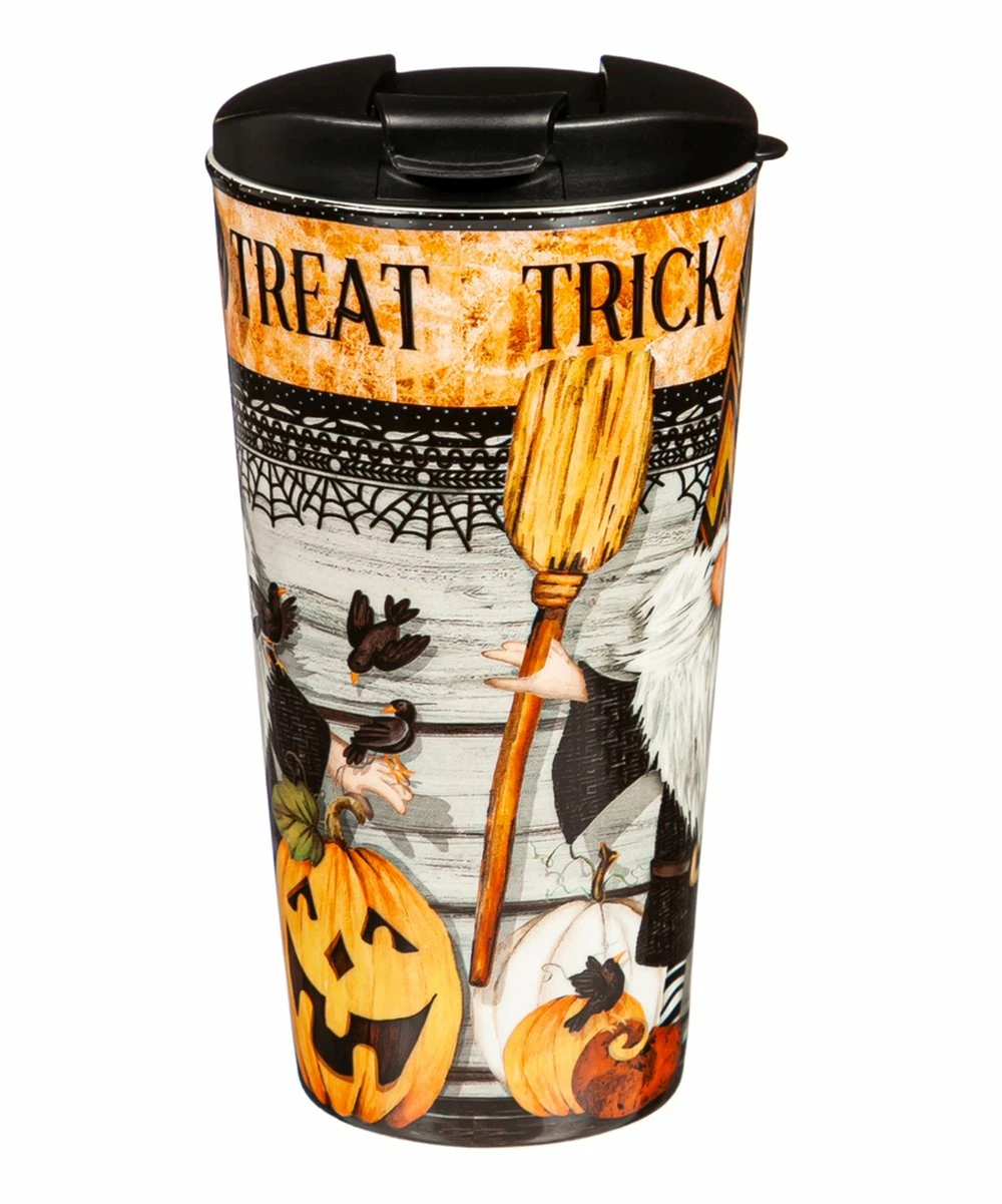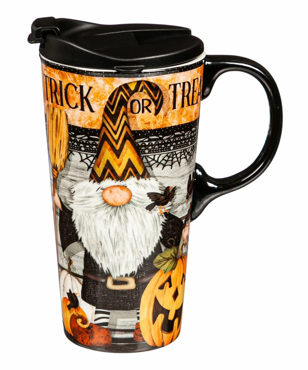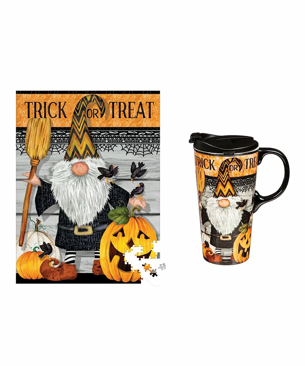 Gift-ready set offering a leakproof ceramic travel mug and 500-piece puzzle with a matching Halloween theme.