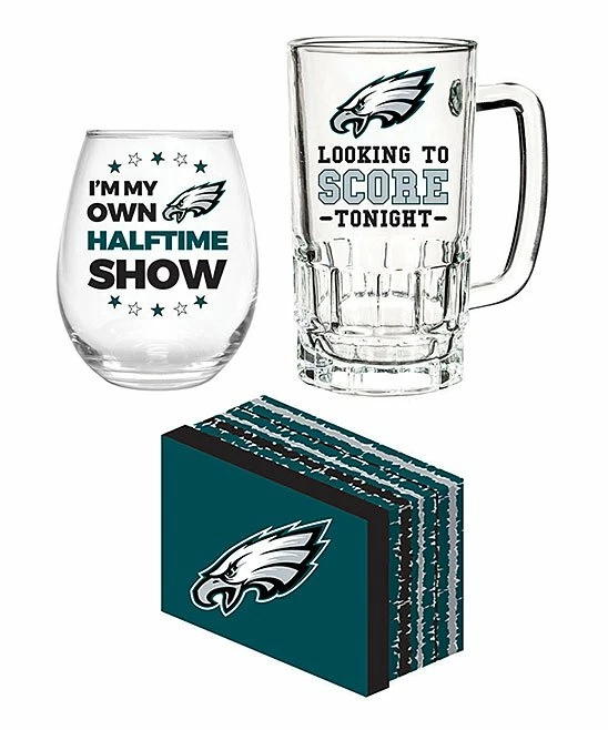 When watching the big game, you can enjoy a beverage from this stemless wineglass and beer stein each displaying cheeky messages and the Philadelphia Eagles logo.