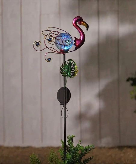 Sassy flamingo garden stake featuring a color-changing lighted orb accent. Built-in solar panel charges the light.