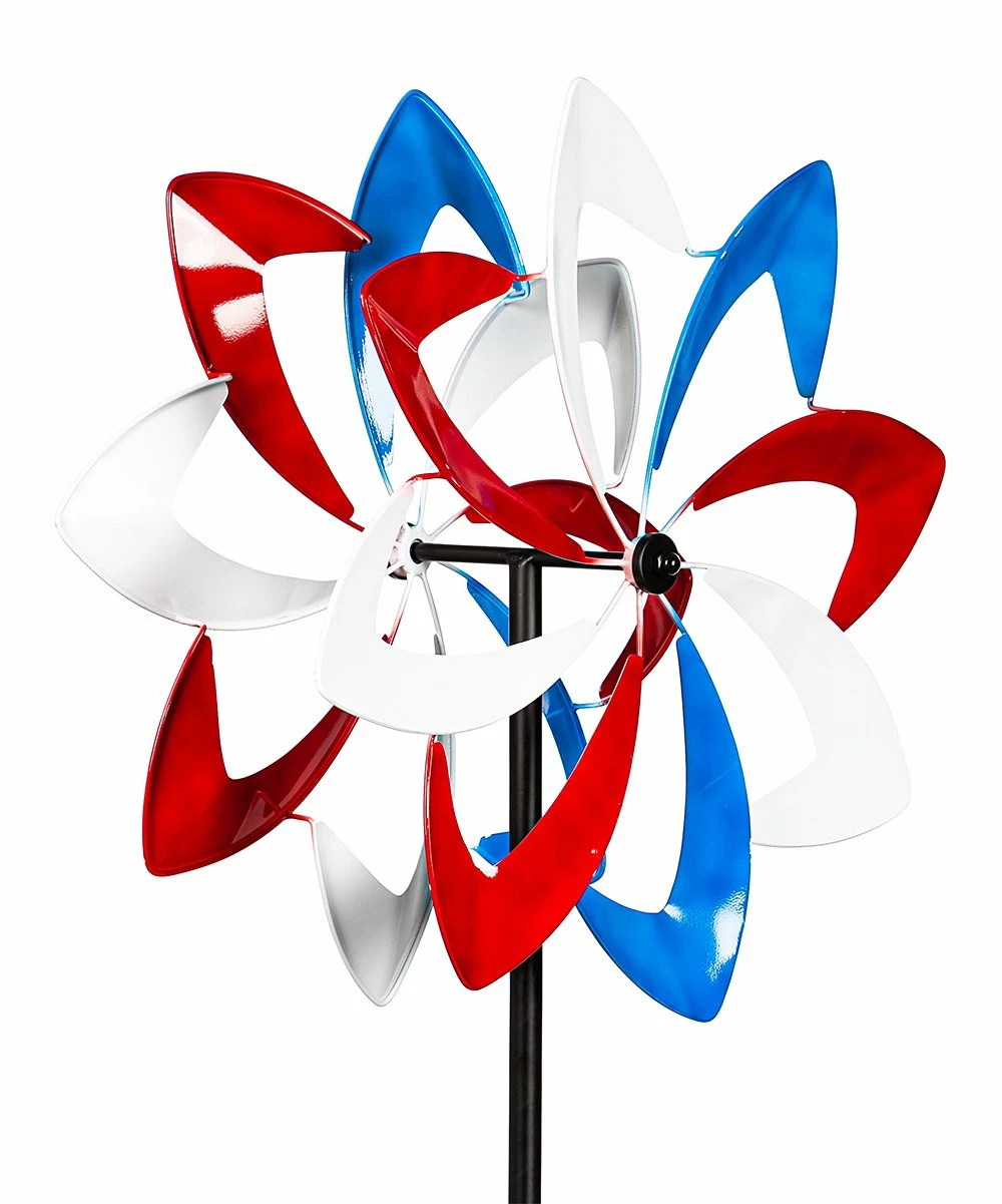 Wind spinner garden stake featuring an all-American flower design. Weather- and rust-resistant finish.