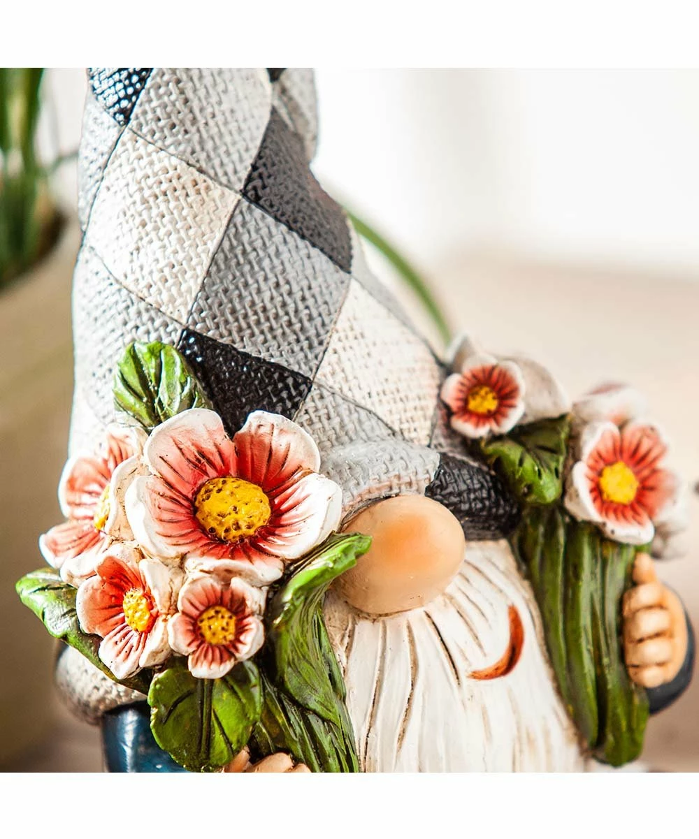 This garden gnome is holding flowers and has a plaid hat for charming displays.