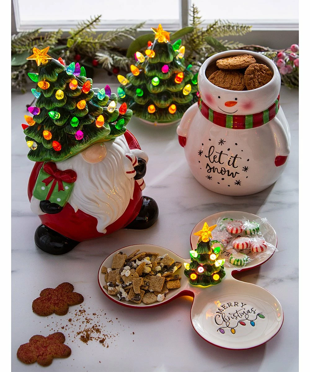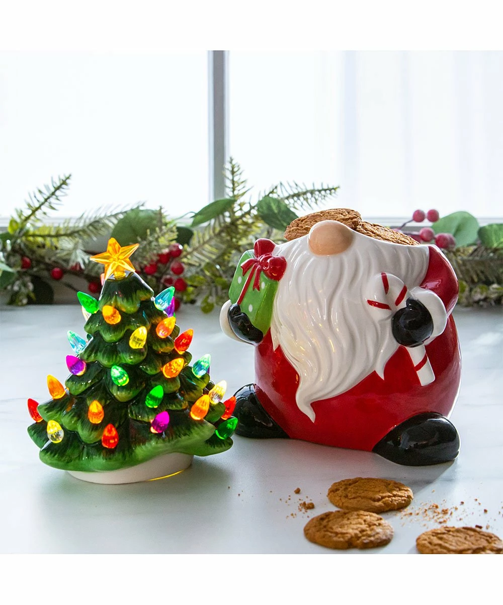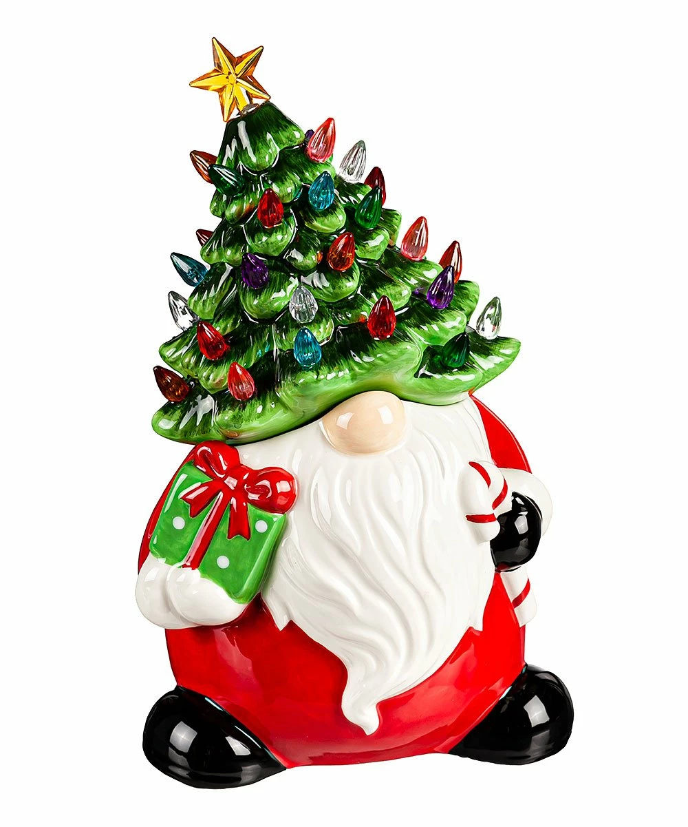 Cookie jar showcasing a hilarious gnome figure wearing a light-up LED Christmas tree.