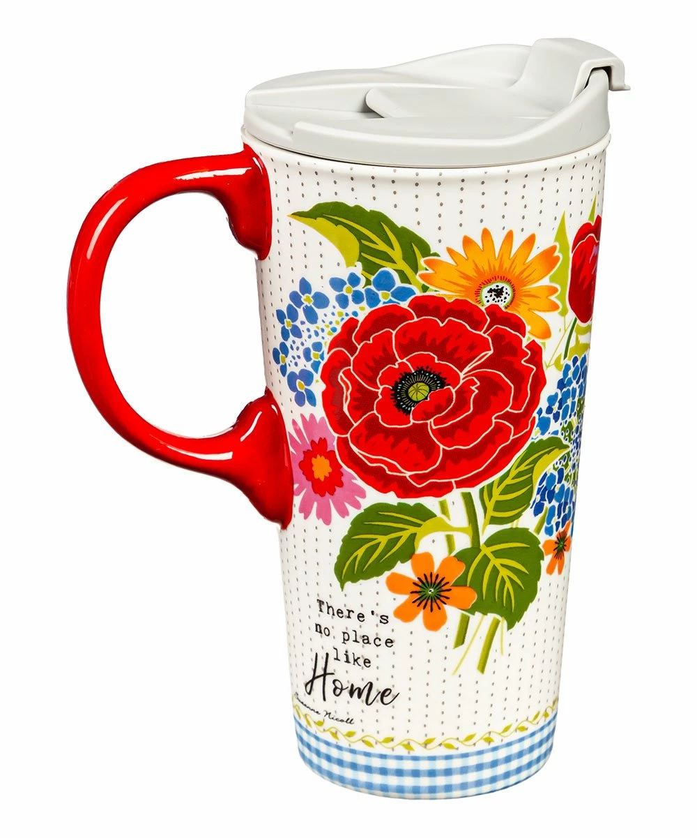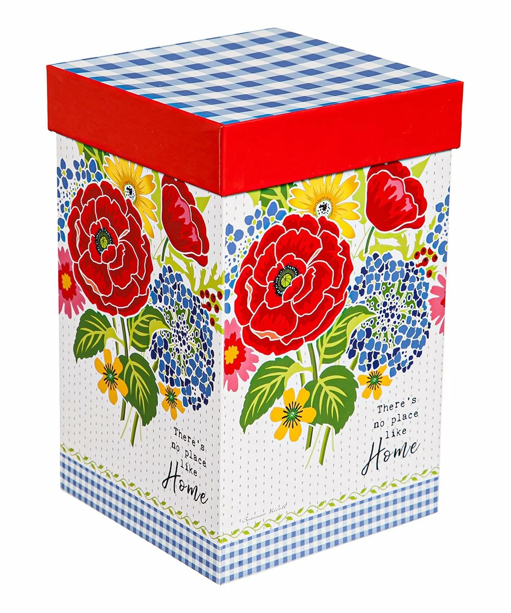- Includes red, blue and white floral mug, white lid and box (three items total)