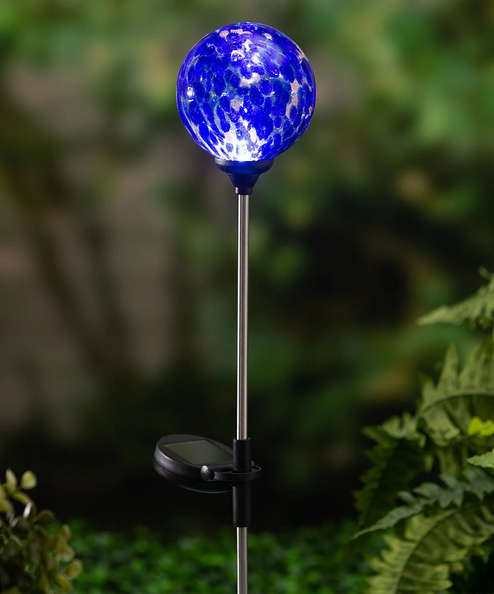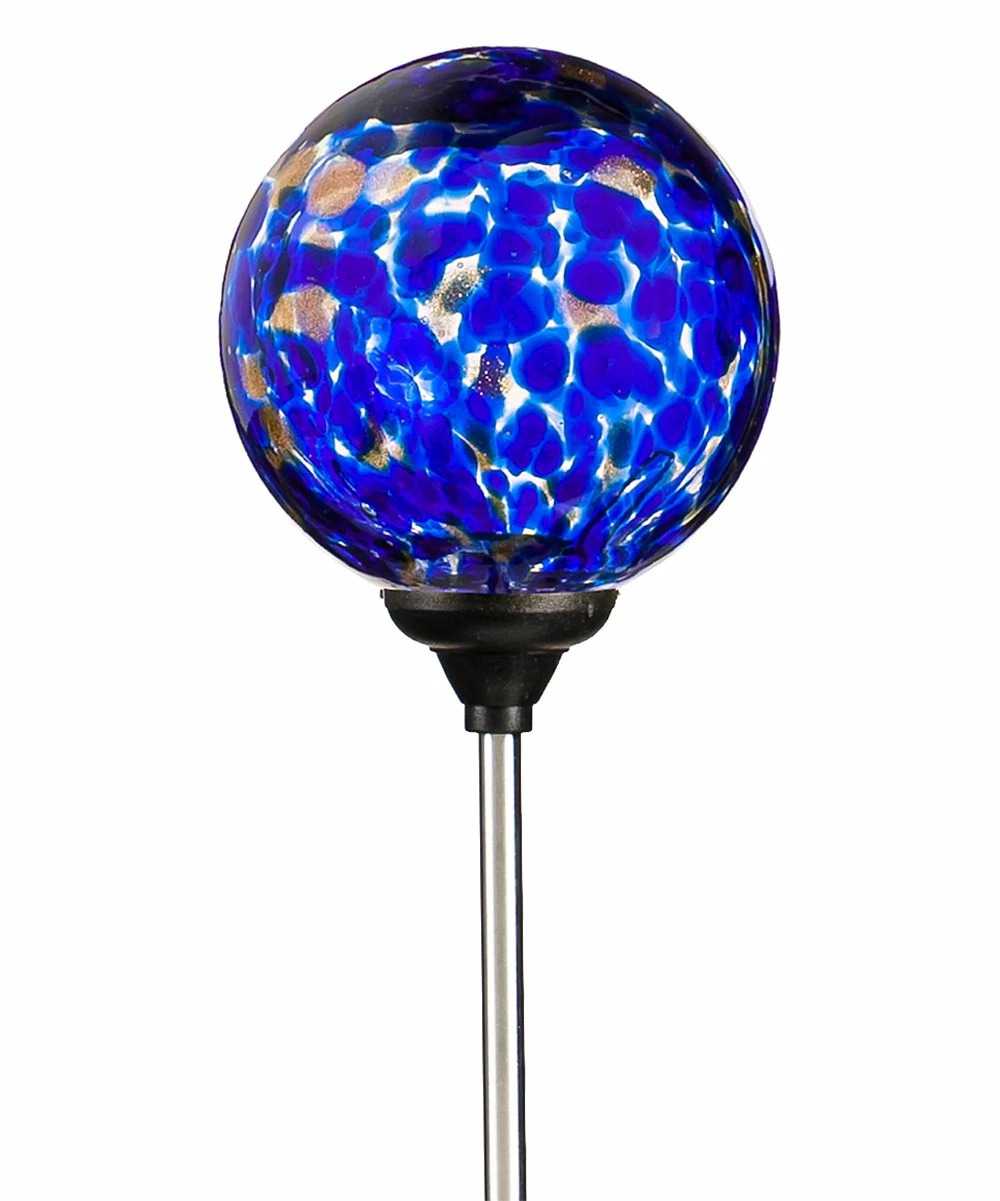 Accent your outdoor space with this garden stake featuring a colorful glass orb. Solar-charged design lights up at night.