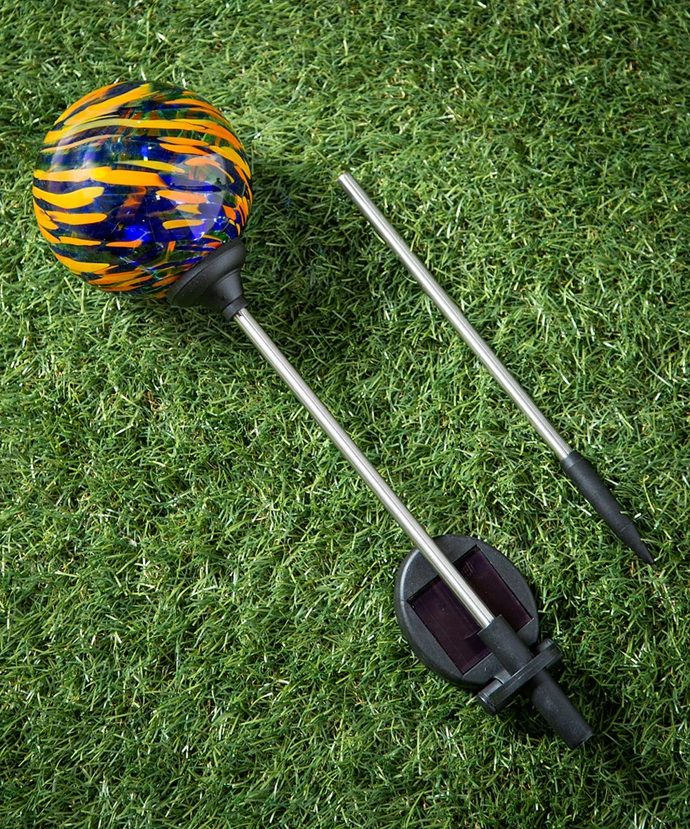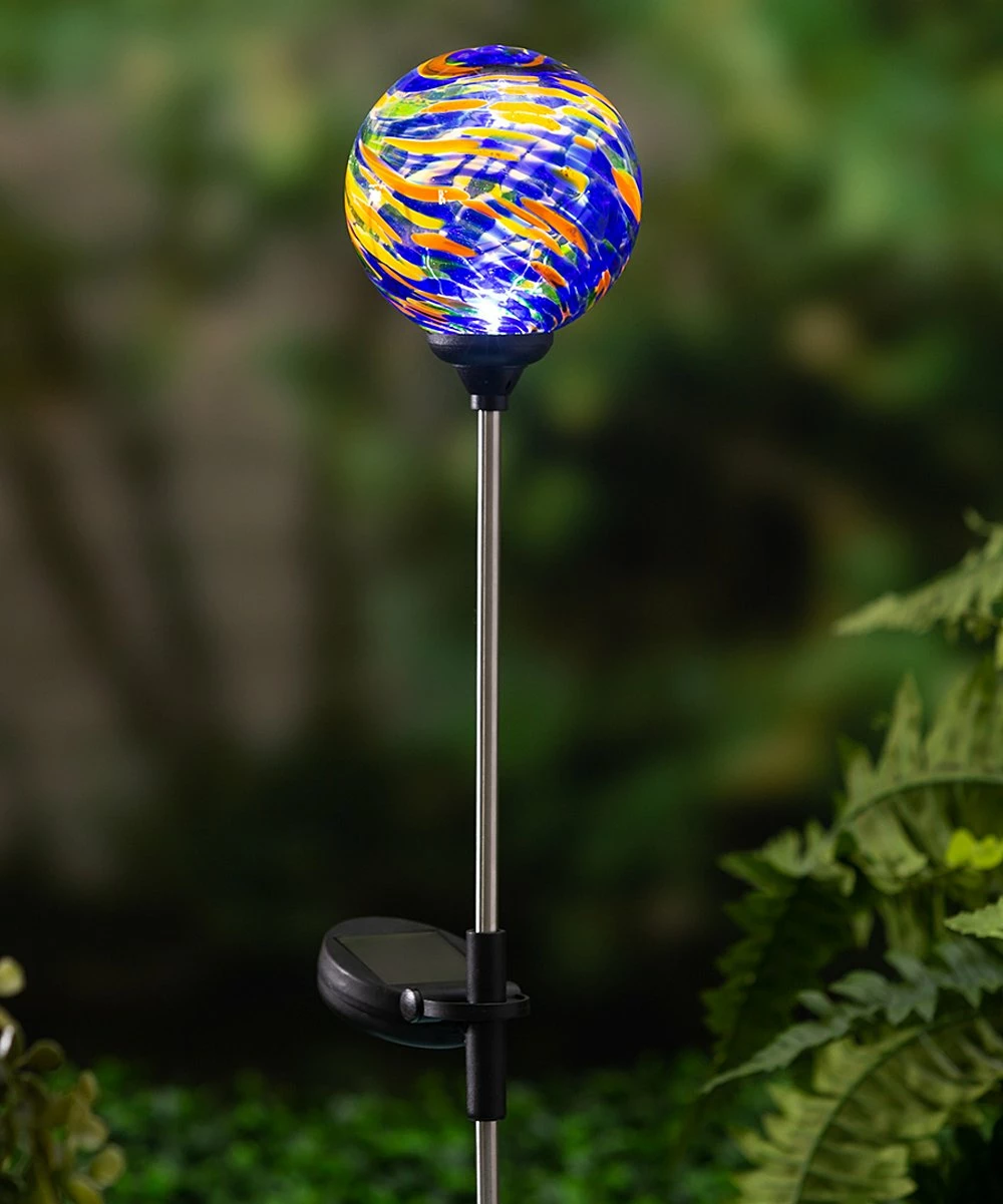 Accent your outdoor space with this garden stake featuring a colorful glass orb. Solar-charged design lights up at night.
