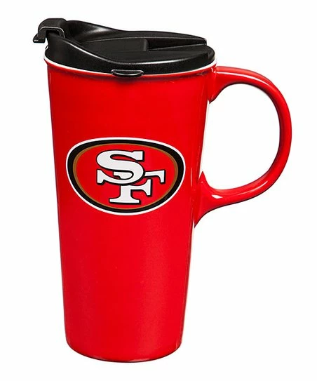 Enjoy beverages on-the-go with this travel mug suitable for drinks from hot coffee to cold water. It features the San Francisco 49ers logo to show off your favorite football team.