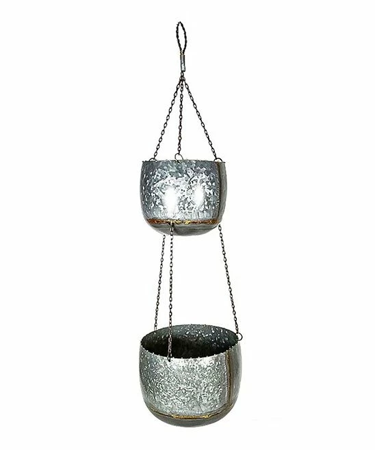 Add farmhouse-inspired flair to your space with this two-tiered metallic planter embellished with a galvanized finish and a metal loop for easy hanging.
