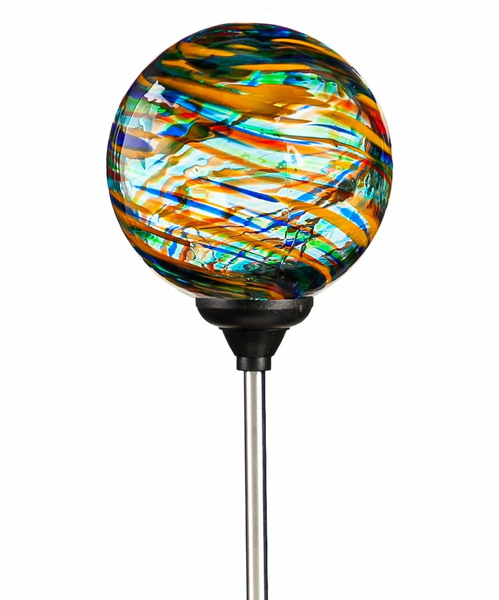 Accent your outdoor space with this garden stake featuring a colorful glass orb. Solar-charged design lights up at night.