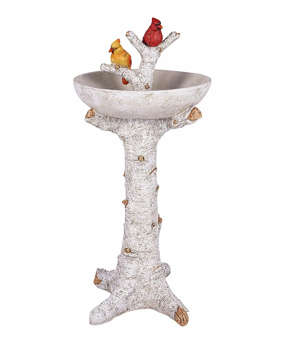Provide a welcoming spot for feathered friends to relax with this resin birdbath. A detailed birch tree design and colorful cardinal accents for nature-inspired elegance.