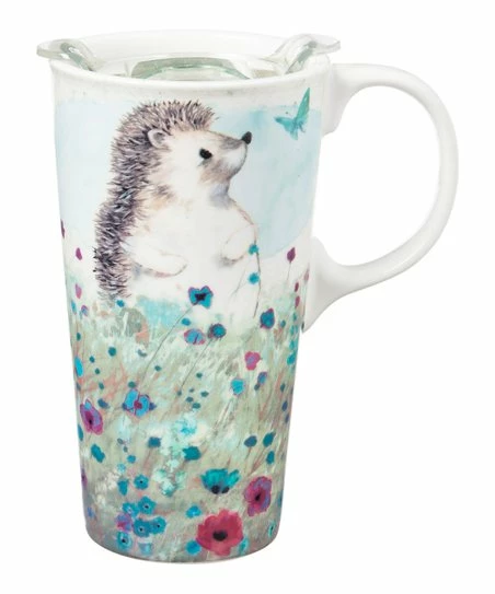 Travel mug that features a press-in lid and a charming hedgehog design. Matching gift box.