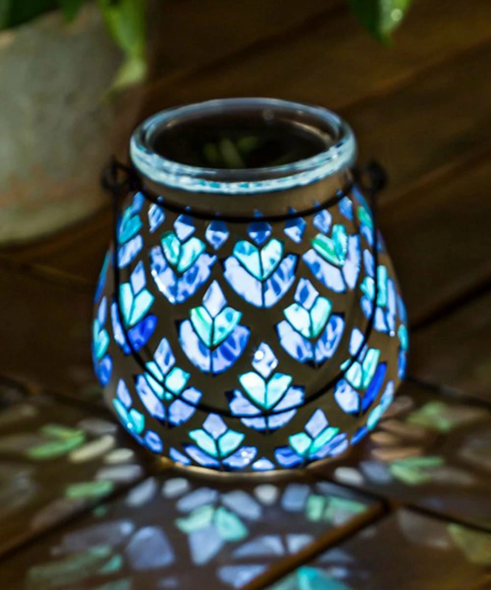 Illuminate your outdoor spaces with this sturdy mosaic lantern that gets its power from the sun.