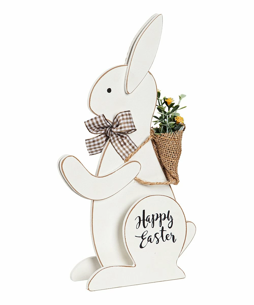 This bunny has a pack full of colorful spring forsythias and is happy to add a playful spirit to your tablescape.
