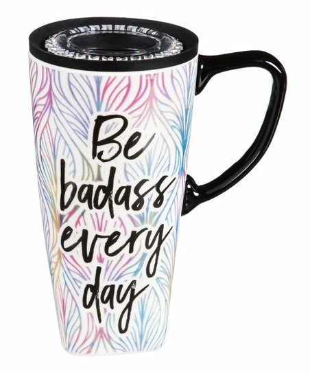Classic ceramic travel mug made with vibrant hues and a humorous message.